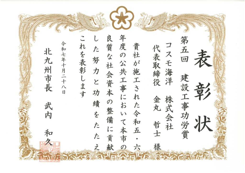 このたび北九州市より「建設工事功労賞」の表彰を受けました。
